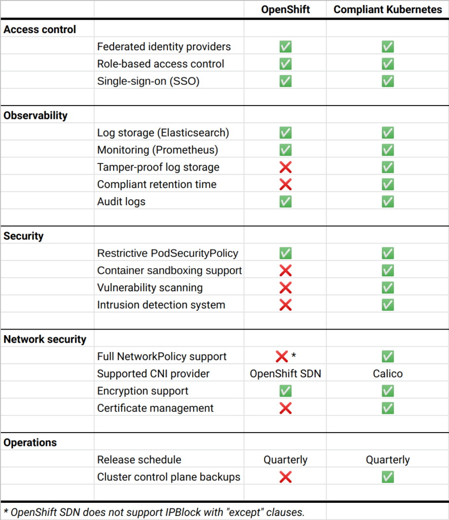 Regarding network security, OpenShift ships with an incomplete Network Policies implementation by relying on vSwitch. Compliant Kubernetes uses Calico, the leading Container Networking Interface provider with support for large-scale networks spanning across private and public clouds. It was also recently updated to support blazingly fast speeds by using the eBPF feature in modern Linux kernels.