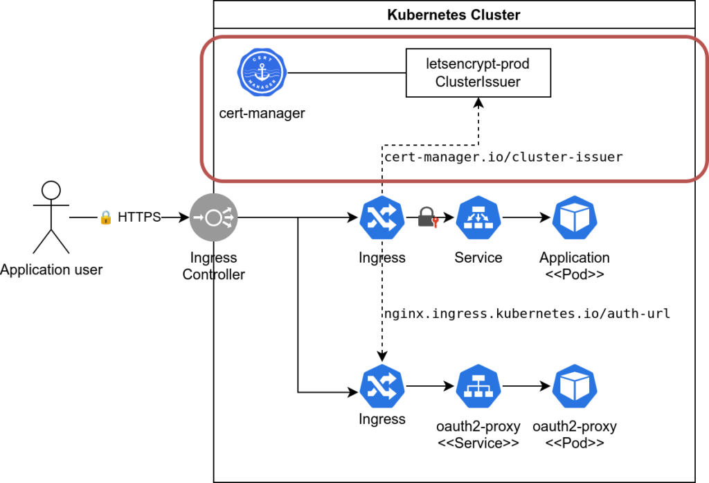 This is illustrated in the diagram above and the same ready-to-use code snippets. See the cert-manager.io/cluster-issuer annotation.