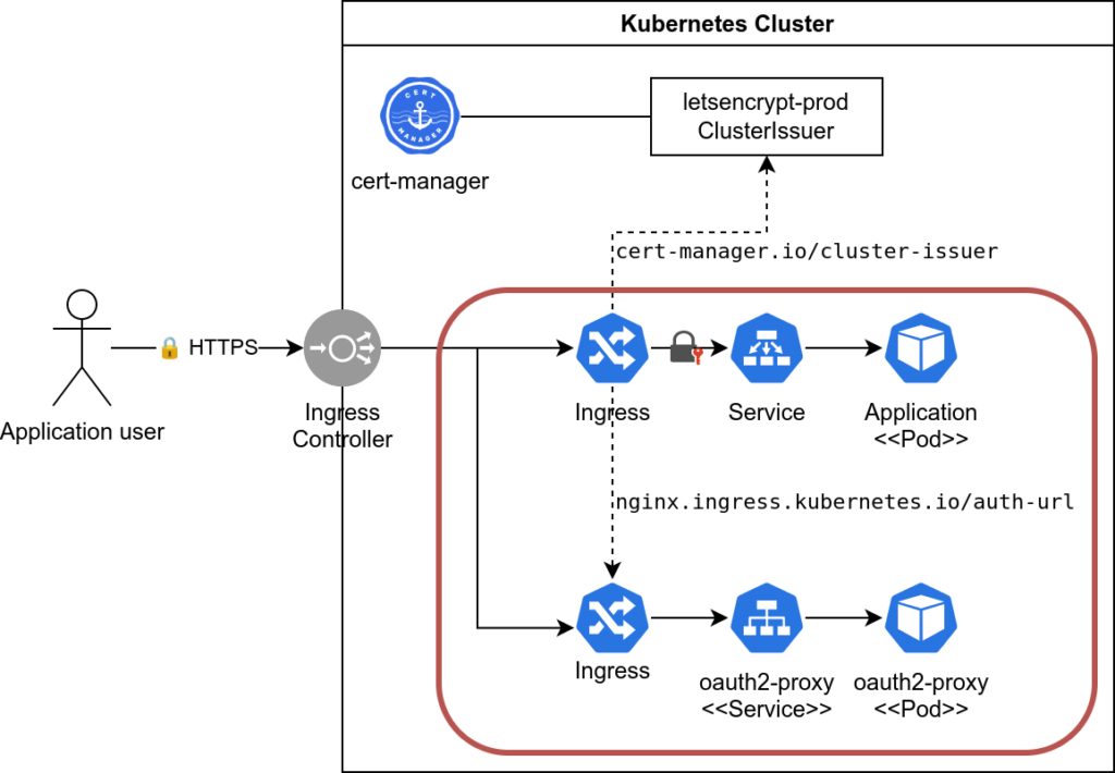 Let me illustrate a solution which I consider simpler, especially for teams already used to Nginx. If all you need is some good ol’ oauth2-proxy, the Nginx Ingress Controller readily integrates with it. Just use the auth-url annotation and the controller will do the rest. The diagram below illustrates how this works.