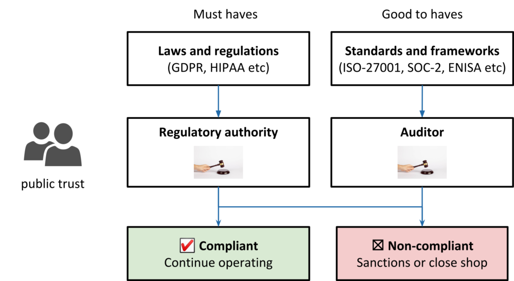 Companies in certain sectors, such as BioTech, FinTech, MedTech, and those processing personal data, need public trust to operate. Such companies are allowed to handle sensitive data, create and destroy money, etc., in exchange for being compliant with certain regulations — in devtalk put, sticking to some rules set by regulators. For example, any bank operating in Sweden is regulated by Finansinspectionen (the Swedish Financial Authority) and has to comply with FFFS. Similarly, any company dealing with personal data is scrutinized by Datainspectionen (the Swedish Data Protection Authority) and needs to comply with GDPR. Such regulation is not only aspirational, but is actually checked as often as yearly by an external auditor. If the company is found to be non-compliant they might be forced to close shop and devs will have to brush up their LinkedIn profile.