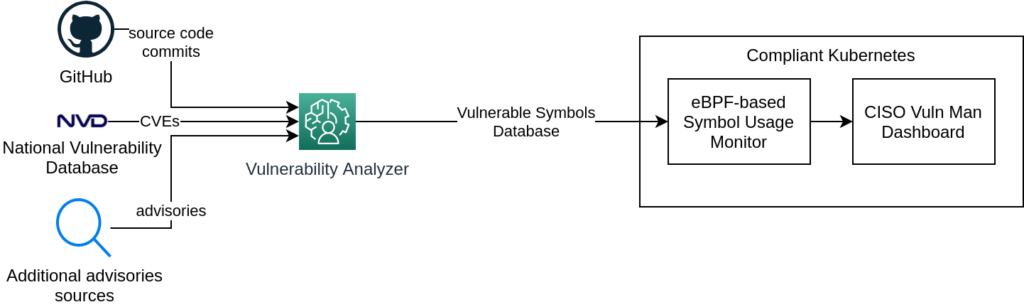 This database is put into context by an eBPF-based symbol usage monitor. eBPF is an exciting new technology available on Linux that allows to safely set probes — both in kernel space and user space — and execute small code snippets when those probes are triggered. For example, uprobe can be added to count how many times a symbol is being executed. Combined with information on the isolation of the container — e.g., NetworkPolicies, mounted volumes, service account, etc. — a vulnerability can be prioritized based on risk, otherwise said, how likely it is to affect your software system given the protections you have in place.