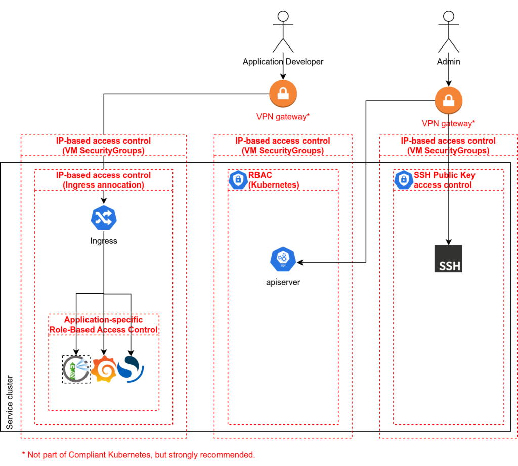 Administrators tend to have two levels of access: the Kubernetes API and direct SSH access to the Nodes. The former is necessary for day-to-day operations, platform component updates and investigations. The latter is necessary for updates, security patches and investigations at the Kubernetes, container runtime and operating system level.