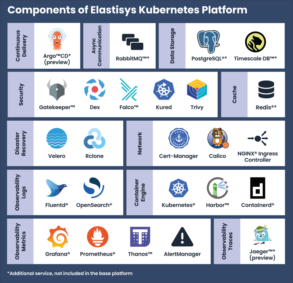Below lists components that are part of the Elastisys Kubernetes Platform.