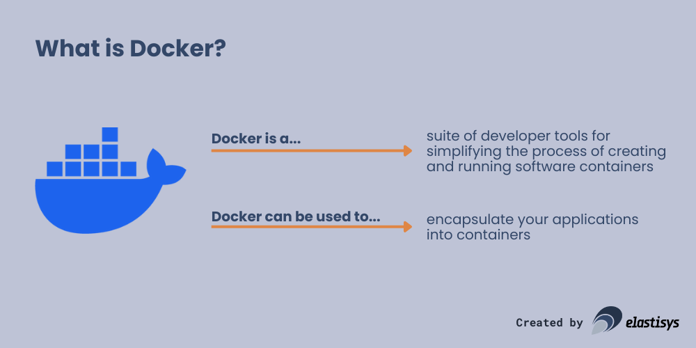 Docker is a suit of developer tools for simplifying the process of creating software containers (containerization) and running these containers.